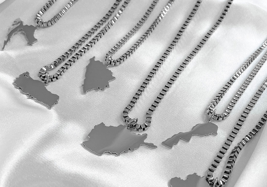 With 29 countries and regions, the map necklaces offer the widest selection of any men's necklace at d'origine. Available: Afghanistan, Africa, Albania, Algeria, Armenia, Bosnia, Germany, Greece, Iran, Iraq, Italy, Kosovo, Croatia, Kurdistan, Lebanon, Morocco, Macedonia, Montenegro, Pakistan, Palestine, Poland, Portugal, Romania, Russia, Sandžak, Serbia, Syria, Tunisia and Turkey. More countries are in preparation.