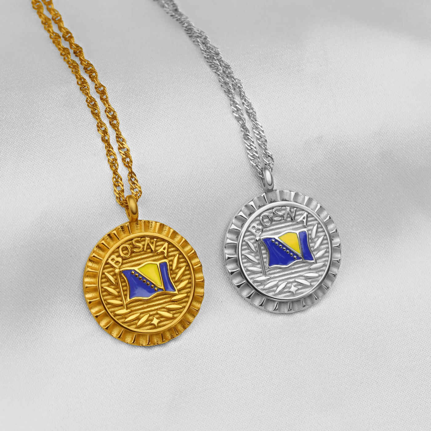 Trage ein Stück Heimat ganz nah bei dir. Diese runde Münzkette mit der bosnischen Flagge erinnert an Familie, Herkunft und besondere Momente – egal, wo du gerade bist.