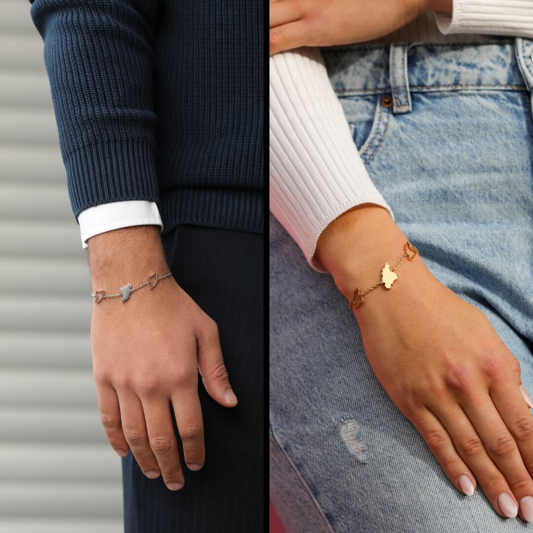 Unsere Landkarten Armbänder verleihen mit den drei Landkarten Anhängern dreifachen Charme und sind sowohl für Damen als auch Herren perfekt geeignet.