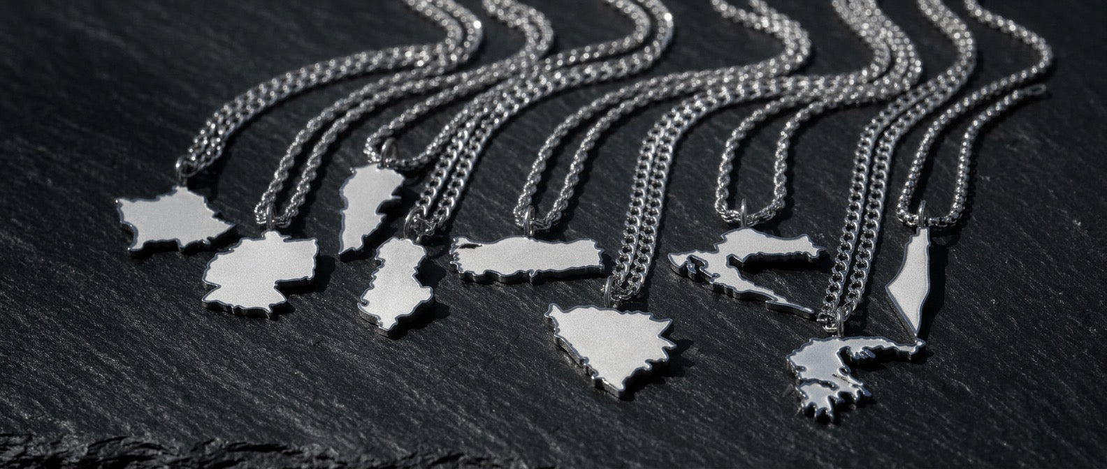 Mit 20 Ländern und Regionen ist die Herren-Landkartenkette die bisher größte Herren-Kollektion bei d'origine. Verfügbar: Afghanistan, Albanien, Bosnien, Deutschland, Griechenland, Irak, Italien, Kosovo, Kroatien, Kurdistan, Libanon, Marokko, Palästina, Polen, Portugal, Rumänien, Syrien, Tunesien und Türkei. Dazu kommt die Afrika-Kette, die den gesamten Kontinent als Anhänger zeigt – für alle mit afrikanischen Wurzeln, unabhängig vom Einzelland.