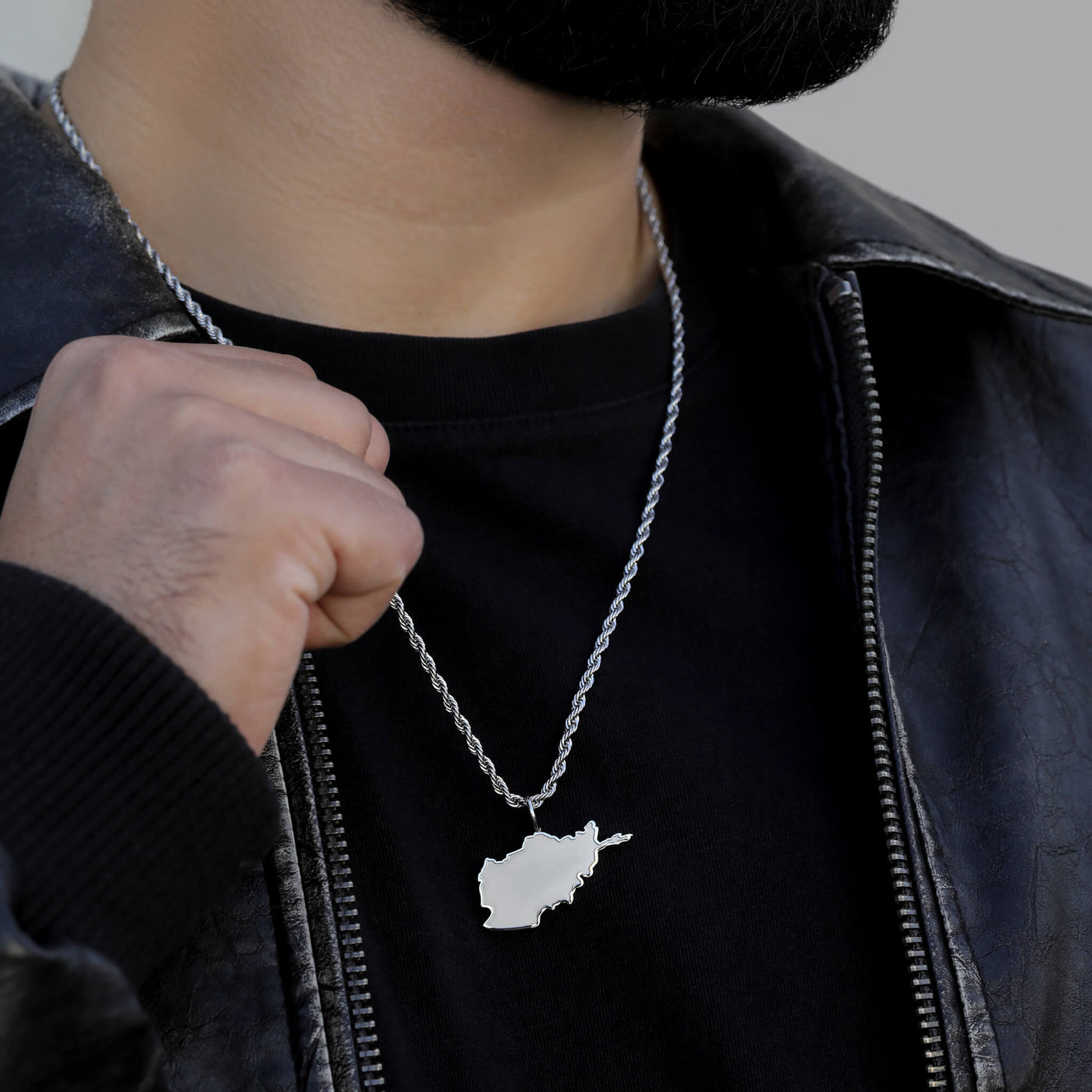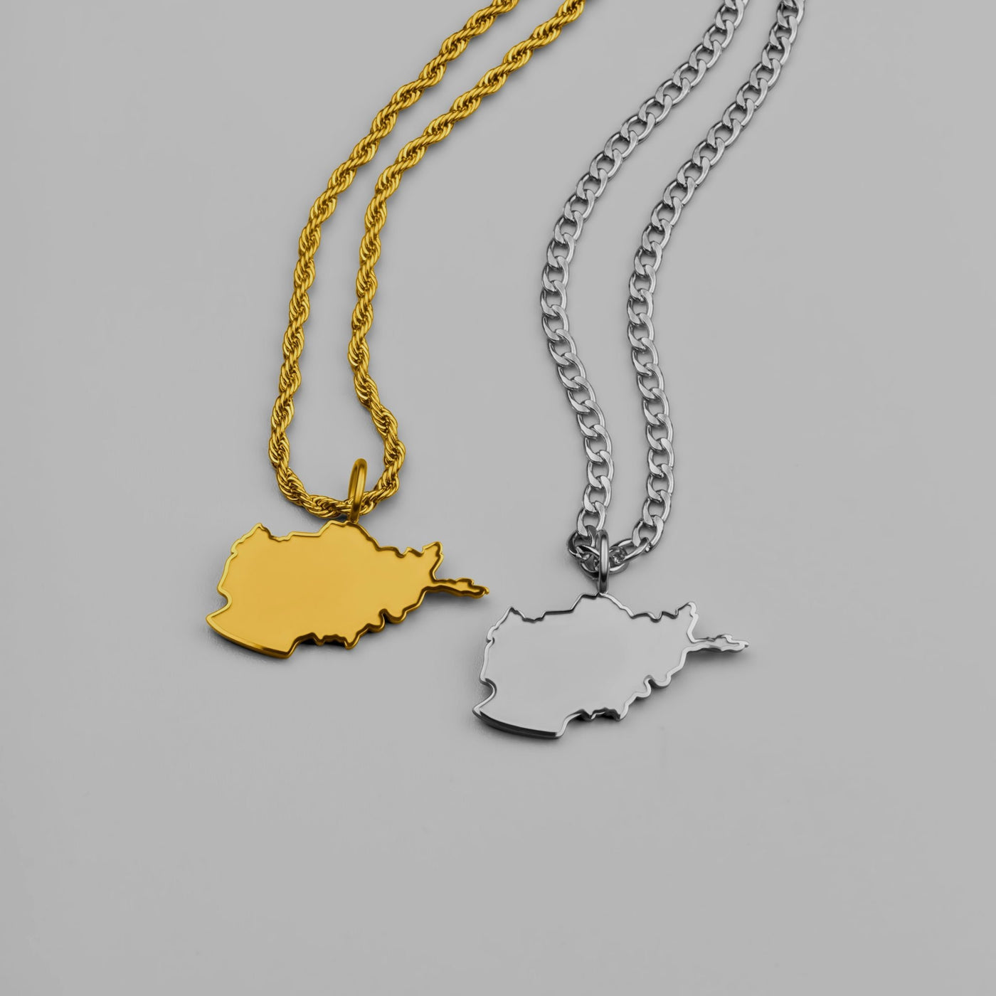 Die einzige Afghanistan-Landkartenkette mit matt sandgestrahltem Anhänger und erhabener, glänzender Kontur. Afghanistan – dein Land, deine Wurzeln, jetzt sichtbar auf deiner Brust.