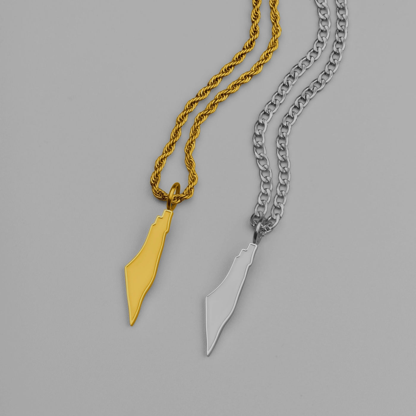 Die einzige Palästina-Landkartenkette mit matt sandgestrahltem Anhänger und erhabener, glänzender Kontur. فلسطين – Min Yaffa la-l-Quds, jetzt sichtbar auf deiner Brust.