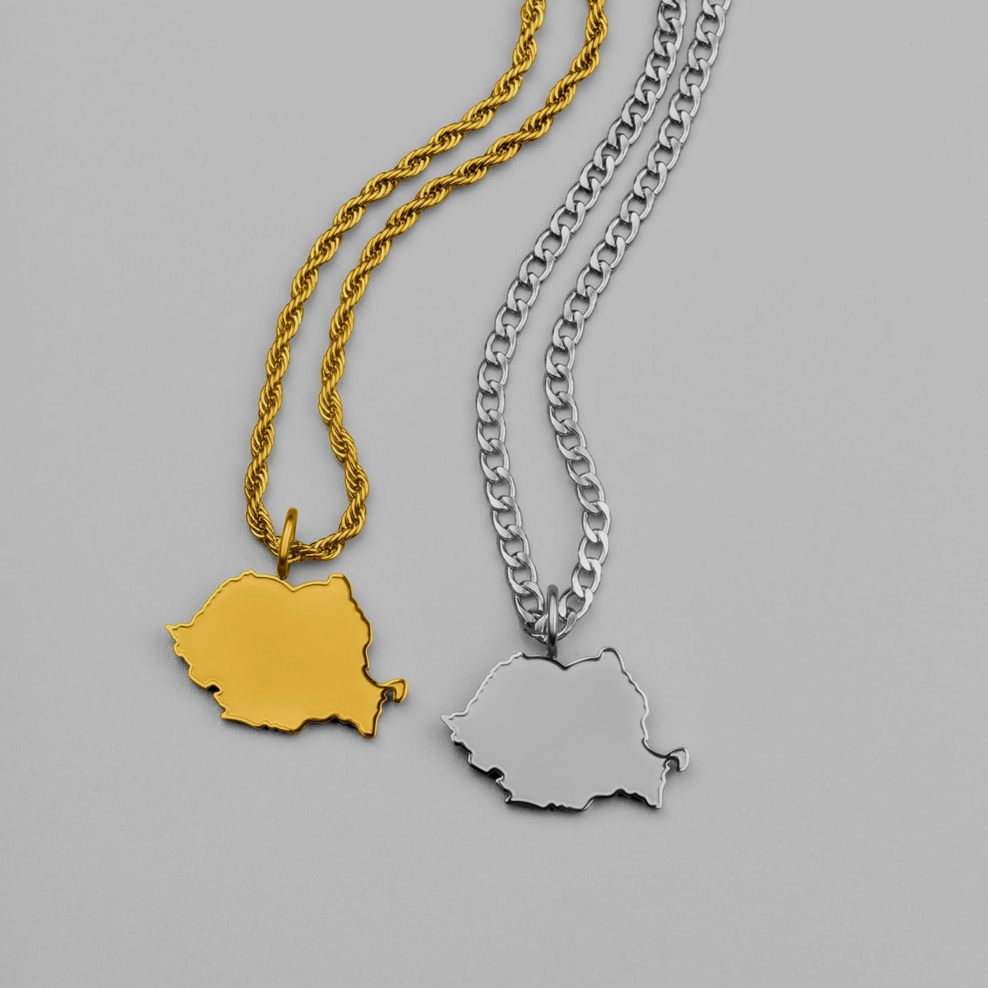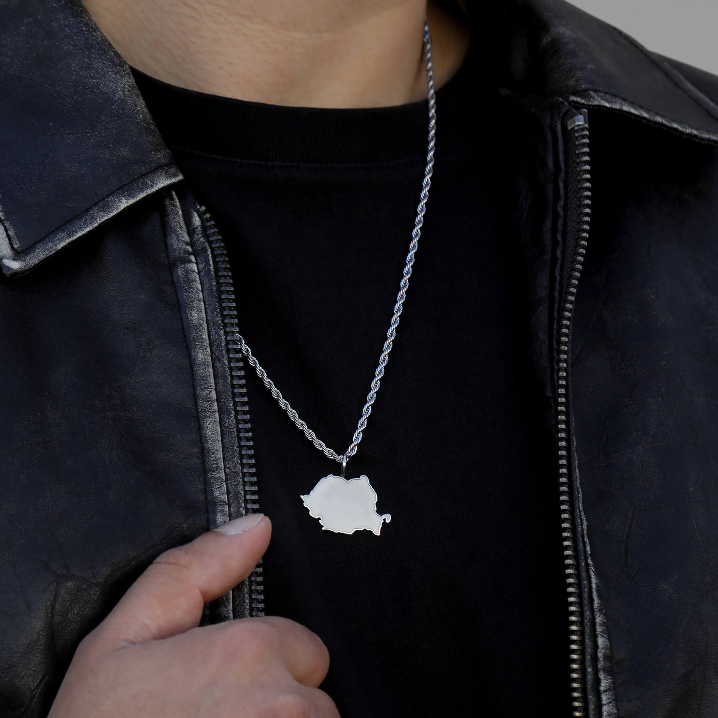 Die einzige Rumänien-Landkartenkette mit matt sandgestrahltem Anhänger und erhabener, glänzender Kontur. România în sânge, România pe piept.