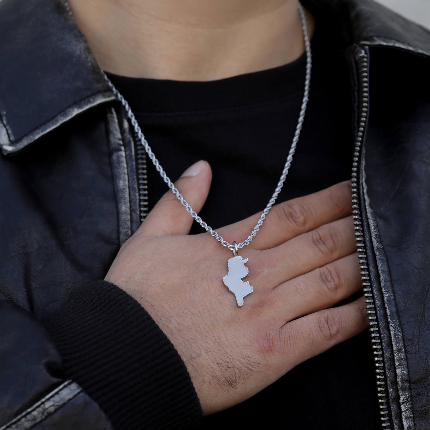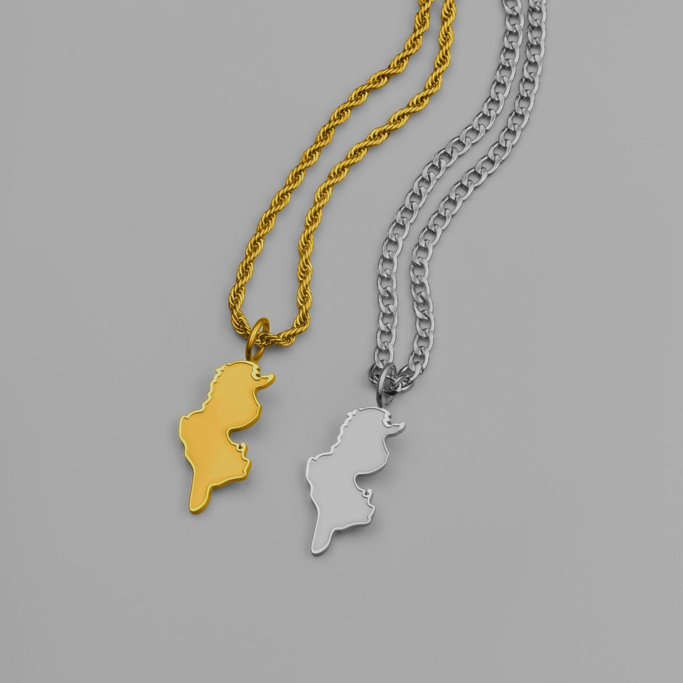 Die einzige Tunesien-Landkartenkette mit matt sandgestrahltem Anhänger und erhabener, glänzender Kontur. تونس الخضراء – Tunis al-Khadra, das grüne Land Karthagos, jetzt sichtbar auf deiner Brust.