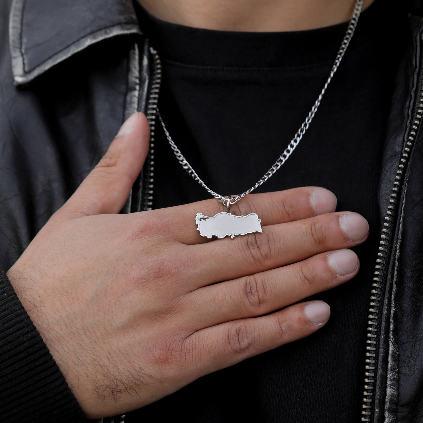 Die einzige Türkei-Landkartenkette mit matt sandgestrahltem Anhänger und erhabener, glänzender Kontur. Edirne'den Kars'a – Türkiye, jetzt sichtbar auf deiner Brust.
