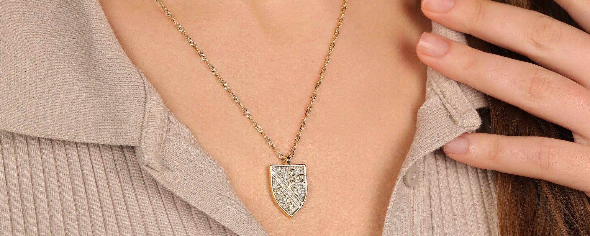 Our Sandžak Collection offers two material lines. The Sandžak necklace for men (56 cm in gold, 65 cm in silver, pendant 2.3 cm) and the Sandžak necklace for women (40 cm + 15 cm) are made from 316L stainless steel – rust-proof, waterproof and scratch-resistant. The Sandžak crest necklace for men (60 cm, crest 2.5 cm) and the Sandžak crest necklace for women (40 cm + 5 cm, hand-set with over 100 stones) are crafted from 18K gold-plated brass. We also offer the Sandžak crest bracelet for women (16 cm + 3 cm) and the Sandžak crest ring for women (adjustable). All variants are waterproof and allergy-friendly. All products come with a 365-day guarantee.