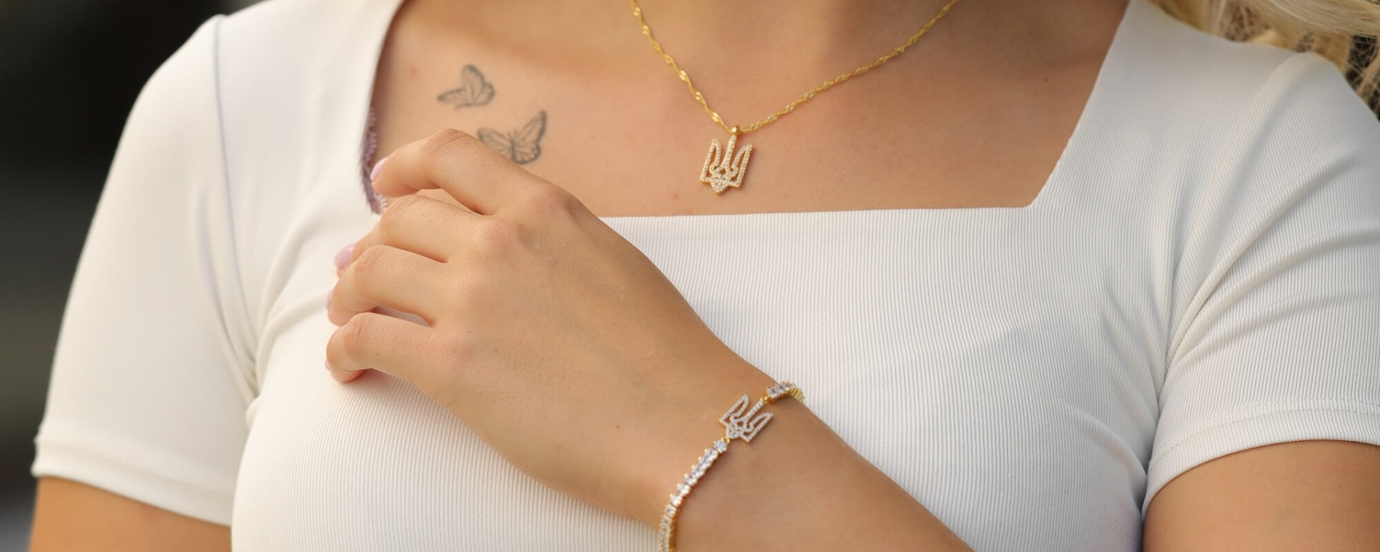 All jewellery in our Ukraine Collection is crafted from 18K gold-plated brass for a particularly warm, rich gold tone. The Ukrainian crest necklace for men (60 cm, pendant 2.9 cm) features the trident in bold relief. The Ukrainian crest necklace for women (40 cm + 5 cm, pendant 2 cm, hand-set with over 85 stones) offers an elegant, sparkling design. The Ukrainian crest bracelet for women (16 cm + 3 cm, hand-set with over 70 stones) pairs perfectly with the necklace. For the complete look, we offer the Ukraine women's bundle – necklace and bracelet at a reduced set price. All variants are waterproof and allergy-friendly. All products come with a 365-day guarantee. We also offer the Ukrainian crest keychain in zinc alloy with the trident motif (9 cm).