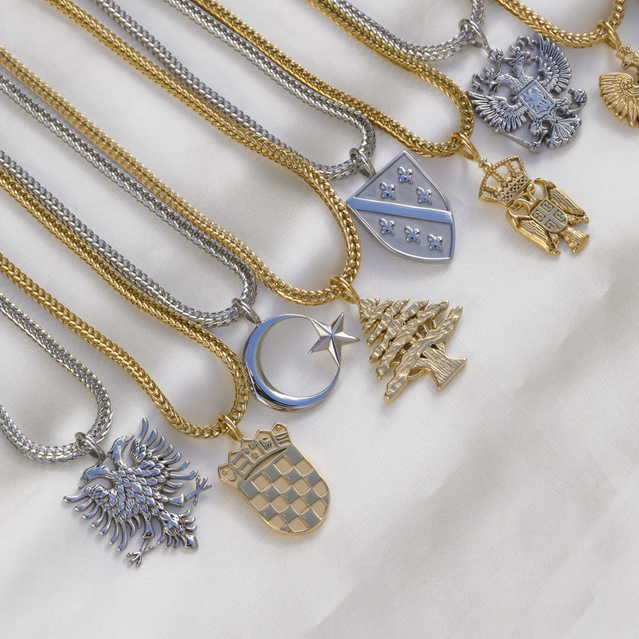 We currently offer the Stainless Steel Crest Necklace V2 for 14 countries and regions. Each emblem is individually crafted and shows the official or cultural symbol of the country: the double-headed eagle for Albania and Serbia, the lily for Bosnia, the Federal Eagle for Germany, the cross for Greece, the Šahovnica for Croatia, the sun for Kurdistan, the cedar for Lebanon, the White Eagle for Poland, the eagle for Romania, the crescent for Turkey and the Holy Crown for Hungary. Crest necklaces for Syria and Russia are also available. More countries are in preparation.