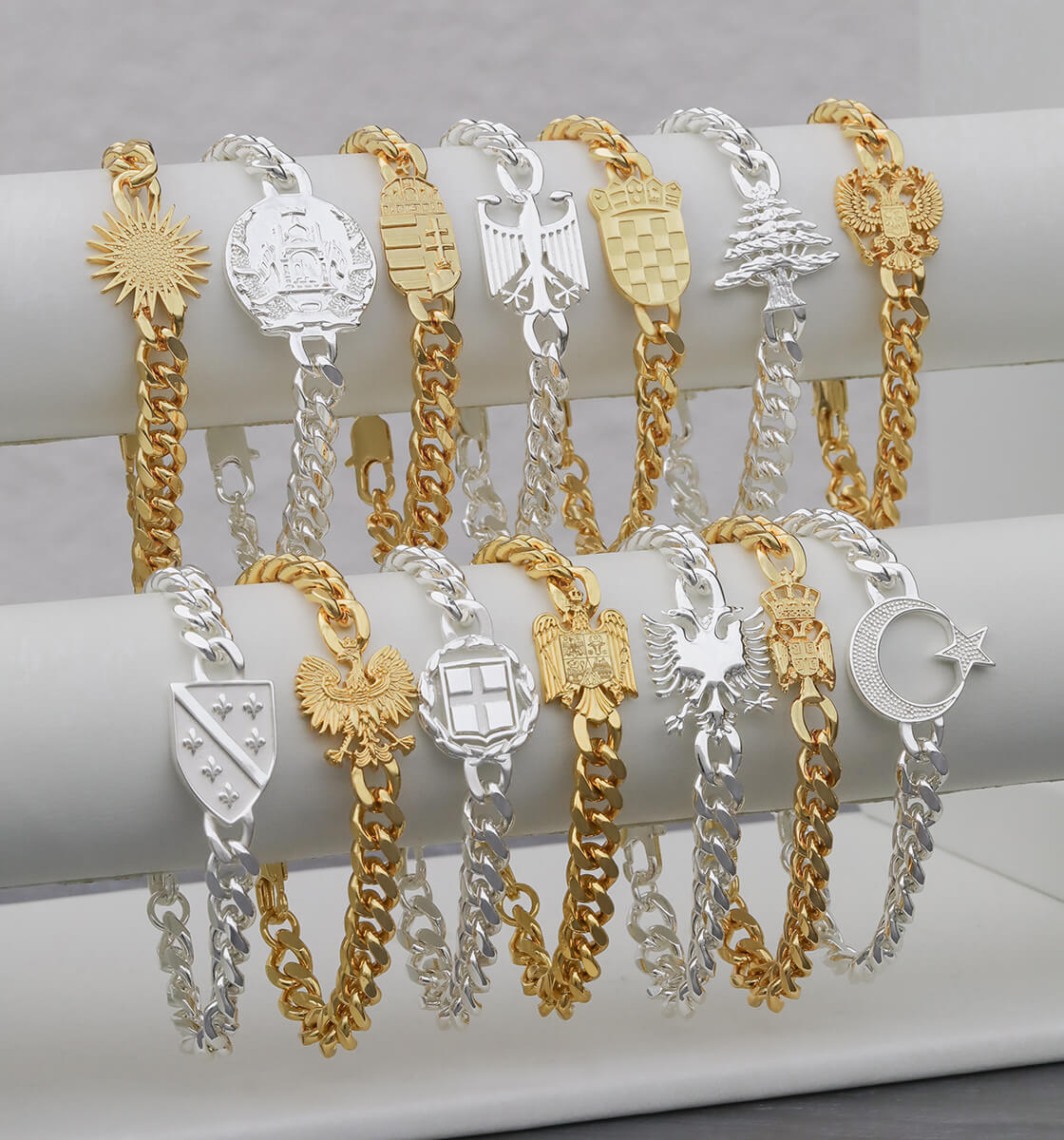 We currently offer men's crest bracelets for 15 countries. Available: Afghanistan, Albania, Bosnia, Germany, Greece, Croatia, Kurdistan, Lebanon, Poland, Romania, Russia, Serbia, Turkey and Hungary. More countries are in preparation. For women, we offer a separate collection with 23 crest bracelets.